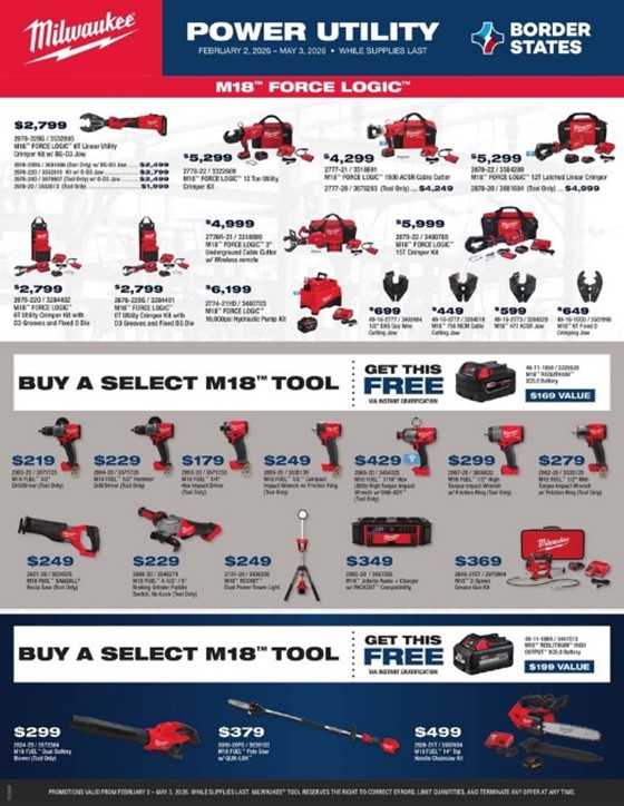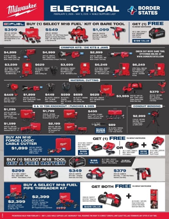 Disclaimer: Promotions valid Monday, February 2, 2026–Sunday, May 3, 2026, unless otherwise stated, while supplies last. Milwaukee® Tool reserves the right to correct errors, limit quantities and terminate any offer at any time.